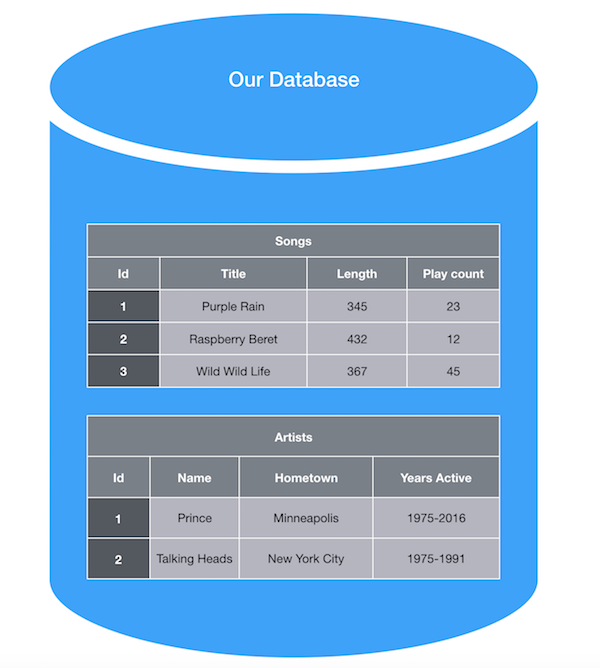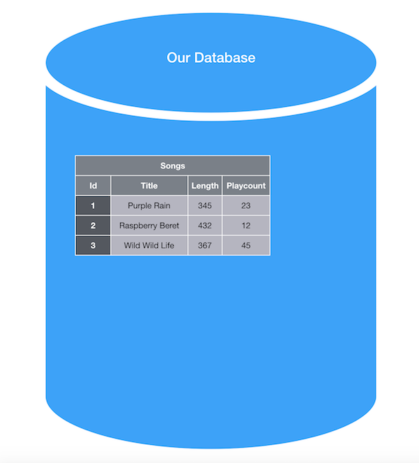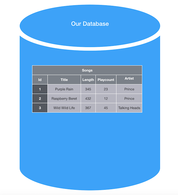 In our database, we have a table that looks similar to an excel sheet where each row of this table is one song entry or record in our database. So far, this is a fairly simple database, holding on to only a few attributes. Without much difficulty, we could update our database to hold additional song attributes by adding additional columns to our songs table.