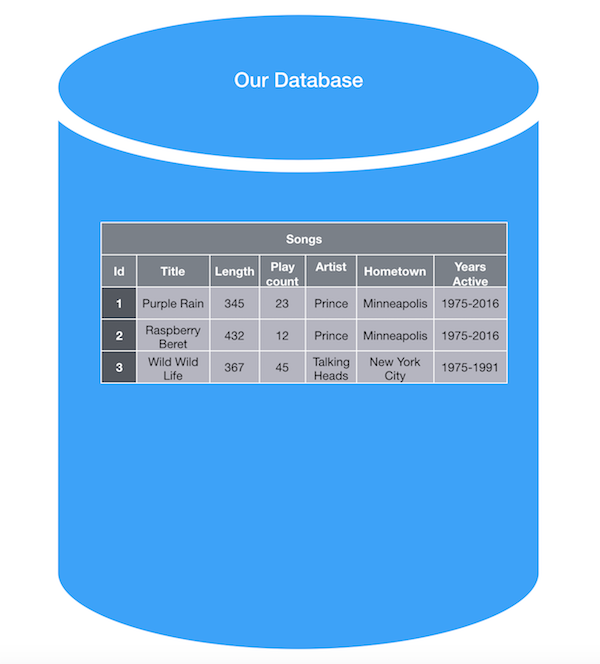 Seems like it works, right? Well… not exactly. What if we wanted to also store information about specific artists, like their hometown or years active. If we imagine what that might look like, we would see more columns on our songs table and many of those columns would be storing the exact same information - every Prince song would be storing ‘Minneapolis’ and ‘1975-2016’: