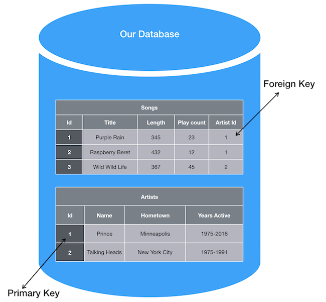 This artist_id is the foreign key on our songs table that relates a song back to the id of an artist on the artists table - also referred to as the primary key of the artists table.
